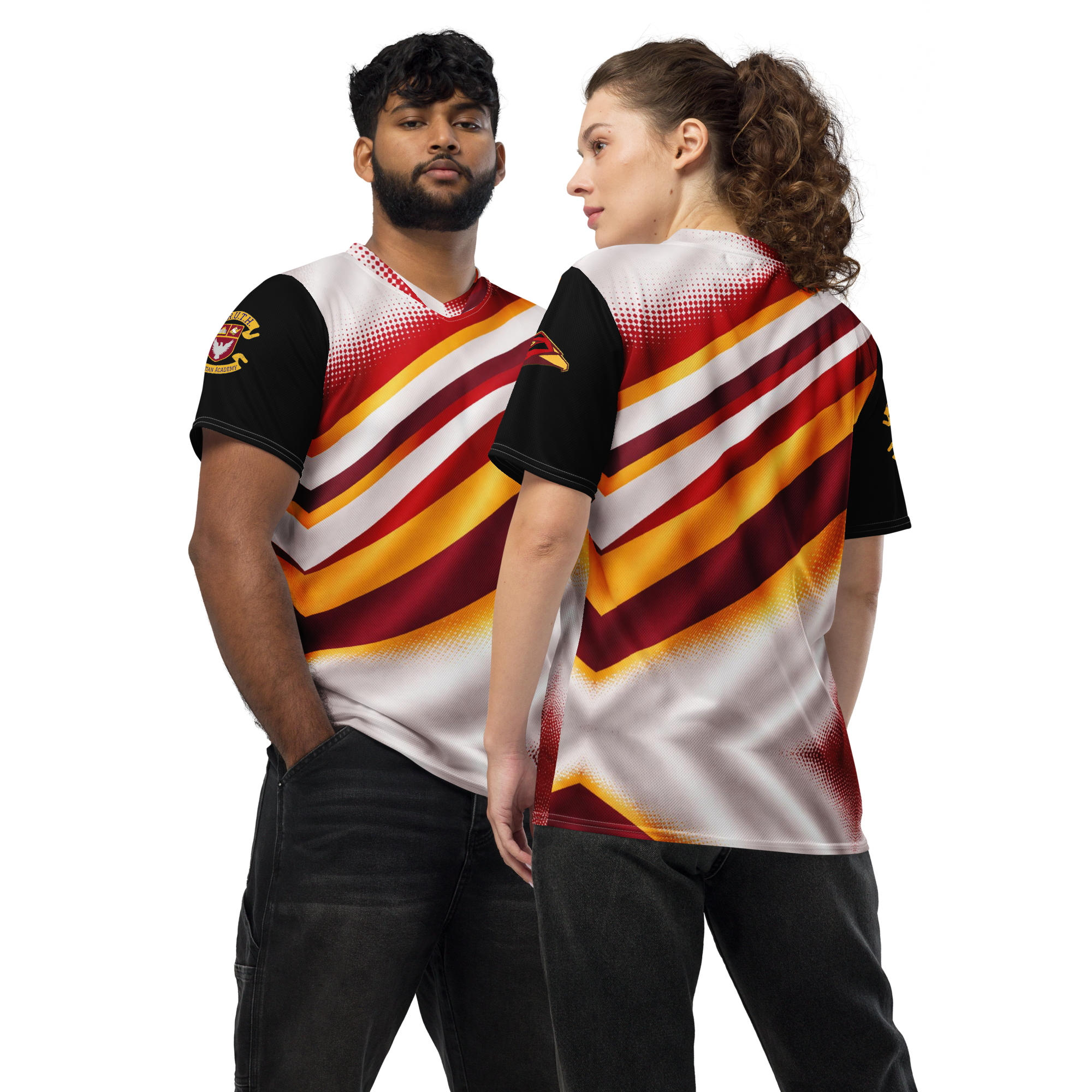 Looking for the perfect sports jersey? We have you covered—made of 100% recycled polyester fabric, this shirt is breathable, moisture-wicking, and has a double-layered v-neck collar that creates a premium look.
